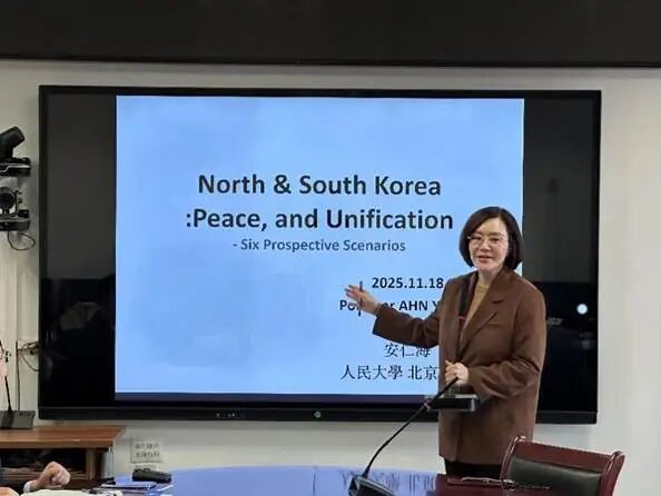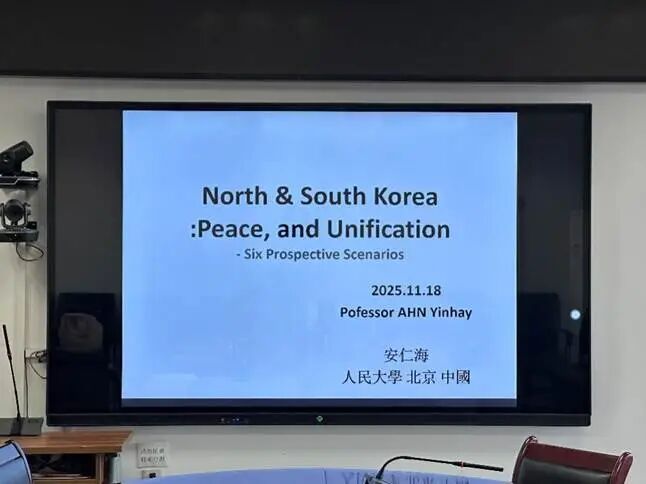 2025年11月18日,中国人民大学区域国别研究院高级访问学者、原韩国国际问题研究协会会长、韩国高丽大学教授安仁海应邀莅临中国人民大学区域国别研究院,以“朝鲜半岛,和平与统一”为题与师生进行座谈交流。