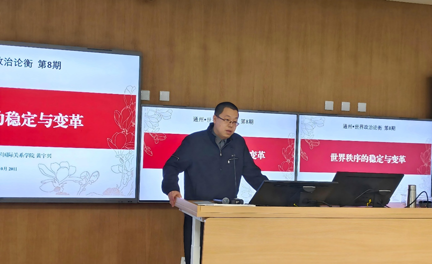 2025年10月20日上午,由中国人民大学国际关系学院、区域国别研究院、澄海全球发展与安全高等研究院联合主办的“通州・世界政治论衡”系列讲座第八期在通州校区顺利举办。中国人民大学国际关系学院教授、澄海全球发展与安全高等研究院世界政治学研究中心副主任黄宇兴教授以“世界秩序的稳定与变革”为题,阐释了世界秩序的演变逻辑与研究路径,为理解当代全球格局变迁提供了新的学术视角。