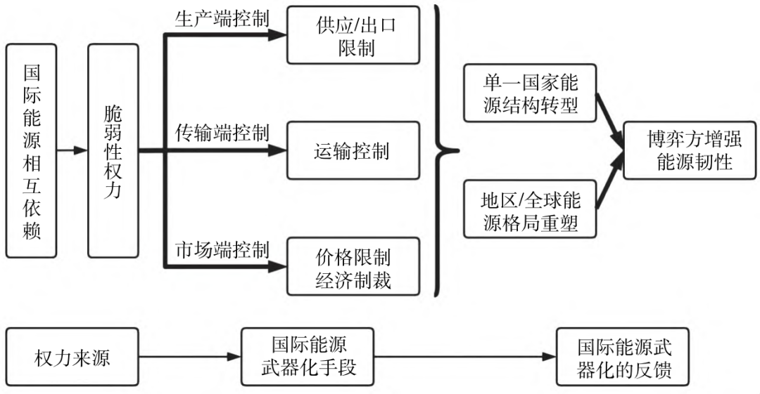 国家将能源进行武器化的权力来源于相互依赖武器化背景下所产生的脆弱性权力。在国际能源贸易网络中,国家通过使用生产端、传输端和市场端的三种能源武器行使脆弱性权力,国家对三种武器手段的交互使用导致了国际能源武器化的形成。
